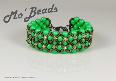 Es grünt! Und zwar Giftgrün! Opulent und aufwendig gefädelt mit SWAROVSKI ELEMENTS Crystal Pearls in Neon-Grün und Rose Montées in Crystal Golden Shadow. Ergänzt wird die Komposition durch die Rocailles in Light Bronce. Elegant und etwas verrückt, ist es überall ein Hingucker.