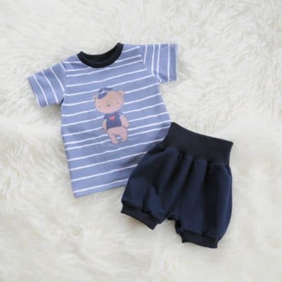 Die passende kurze Pumphose in dunkelblau vervollständigt das Outfit. Das besondere an der Hose: sie wächst mit, das heißt ihr habt lange Zeit etwas von diesem Basic-Stück. Getragen werden kann die kurze Pumphose von Größe 86 bis einschließlich Größe 92.