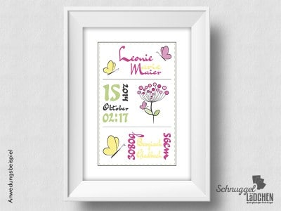 Dieses Geburtsbild – Pusteblume mit Schmetterlingen – ist ein tolles Geschenk für frischgebackene Eltern, zur Taufe, zum Geburtstag oder einfach als nette Geste und Mitbringsel.