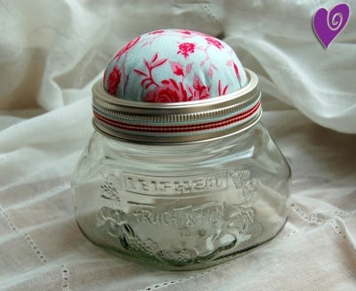 Ein hochwertiges Einmachglas wird zu einer dekorativen Aufbewahrung für Nähutensilien, Knöpfe, Bänder oder was Dir noch so einfällt.