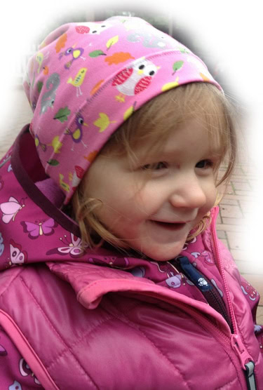 Schöne leichte Übergangsmütze aus Jersey mit süßen Eulen, Vögeln und Eichhörnchen.