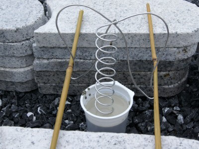 Bilde eine Konstruktion von Steinen, Stangen oder anderen Hilfmitteln, die gerade herumliegen. Als nächstes wird der Draht in den Beton eingetaucht. Das Gerüst solltest du ca. 4 Stunden stehen lassen, bis der Beton etwas angetrocknet ist. Lasse denn Beton (auch ohne Gerüst) trotzdem 24 Stunden trocknen und entferne erst dann den Joghurtbecher.