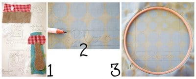 Das Motiv in den Stickrahmen einpassen. Dafür zuerst die Schraube etwas lockern, den inneren Ring herausnehmen und den Stoff mittig auf den größeren Ring legen. Darauf dann den kleinen Ring legen und andrücken, ggf. nochmal richtig justieren damit das Motiv genau in der Mitte liegt. Die Schraube etwas anziehen (nicht zu stark), damit eine gleichmässige Spannung entsteht.