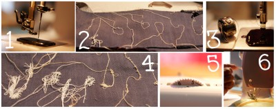 2) Die richtige Fadenspannung zu finden ist der schwierigste Teil an der ganzen Geschichte. Man muss immer wieder auf Teststücken nähen um die Spannung zu überprüfen. Was ganz wichtig ist: Bitte nur Baumwollgarn verwenden! Die Tests auf der linken Seite wurden mit Synthetikgarn gemacht, es hat -wie man auf der Rückseite auf Bild 4) bewundern kann- überhaupt nicht funktioniert. Das Baumwollgarn dagegen ging sehr gut.