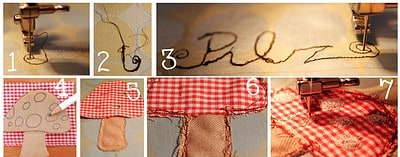 1) Der Pilz ist fertig. 2) Da das Ganze noch ein bisschen nackig wirkt, kommen jetzt noch ein paar Ranken dazu. (und da ich wohl wissend schlecht zeichnen kann, habe ich mir das Muster kurzerhand auf einen austauschbaren Hintergrund gepinnt, damit ich nicht immer radieren muss) Das Muster wird auch wieder freihand nach Vorlage aufgezeichnet. 3) Sticken wie beschrieben mit hellblauem Garn. Auch hier wurde jede Ranke mindestens 3x nachgestickt. So, fertig für's Erste. Die anderen Motive und die Anleitung für das fertige Buch folgen im Laufe der Woche.