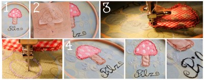 Dann kann's losgehen. 1) Die Nadel immer entlang der vorgezeichneten Linie bewegen, mit den Händen am Rahmen die Richtung bestimmten. Die Nähgeschwindigkeit ist natürlich nicht überaus schnell, man soll ja mit dem Führen hinterherkommen. Ruhig zwischendrin immer wieder anhalten, den Rahmen drehen und dann weiter sticken.