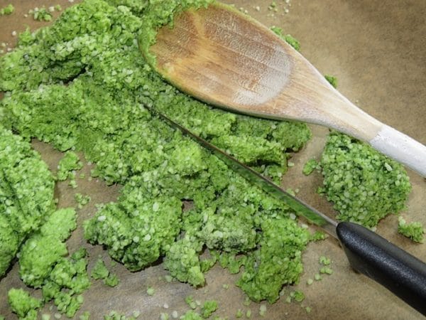 Die Mischung (siehe Bild 3) streicht man auf ein mit Backpapier belegtes Backblech und trocknet es im leicht geöffneten Ofen für ca 2 bis 3 Stunden bei 50 °C. (Oder ihr lasst es an einem anderen Ort für längere Zeit trocknen).