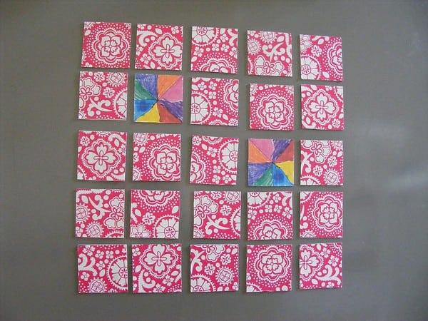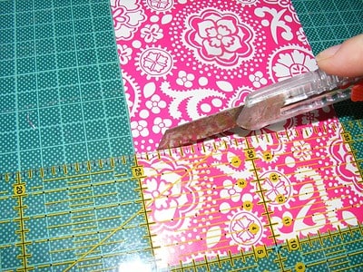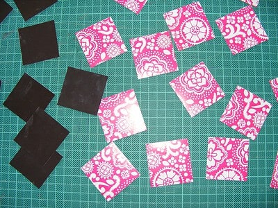 Wenn ihr Fotopapier in Postkartengröße habt, kann man 6 Teile à 5x5 cm schneiden. Ich habe 10 Papiere verbraucht (jeweils 2 aufeinander!) , habe also 30 Teile bzw. 15 Paare. Am einfachsten geht es mit so einem Patchwork Lineal und Schneidematte, aber das Fotopapier läßt sich auch gut mit der Schere verarbeiten.