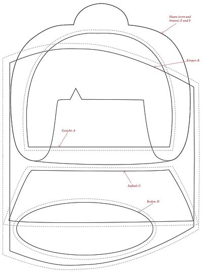 Zunächst werden die Fußteile mit dem Körper und dem Gesicht bzw. Schnittteil A/B an den kurzen Seiten zusammengenäht. Dann wird die Rundumnaht gemacht. Der Boden bleibt offen.