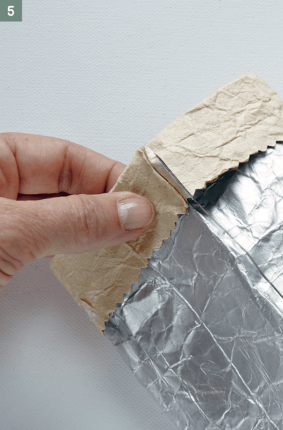 Hat man sich für die silberne Seite entschie den, knickt man den Rand um. Die Kante sieht schöner aus, wenn man sie mit der Zickzackschere bearbeitet.