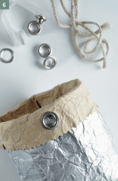 Noch eine Öse in den Umschlag und an schließend eine kleine Kordel hindurchziehen – fertig ist eine neue Verpackung oder ein kleiner Blumenübertopf.