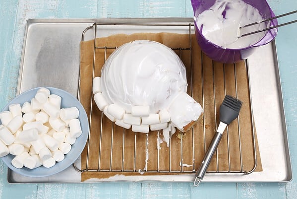 – Jetzt zügig die Marshmallows ringsum festdrücken, am unteren Rand beginnen. Sollte der sehr zähe Guss dabei schon zu fest werden, feuchtet die Marshmallows auf der Klebeseite mit etwas Wasser an.