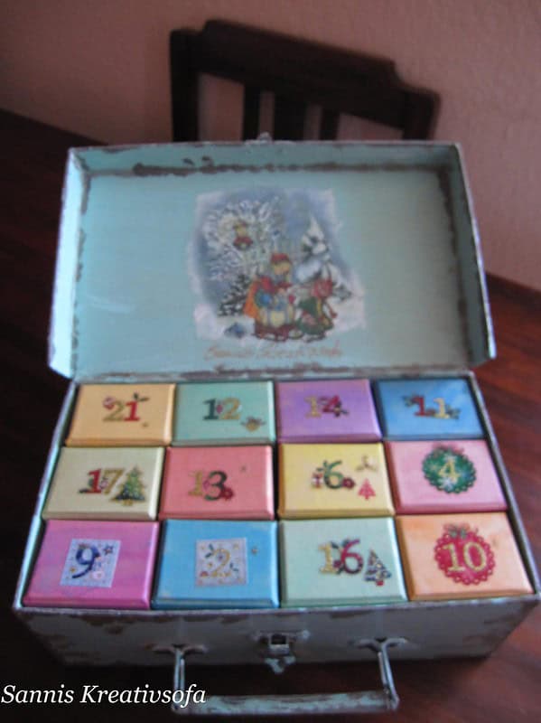 Da kam mir die Idee mit den Adventskalenderkoffern. Die Idee ist zwar nicht ganz neu, da ich sie vor zwei Jahren schon einmal in der Weihnachtszeit genutzt habe. Aber ich habe ein paar Veränderungen vorgenommen. So das das ganze jetzt doch noch einmal komplett anders aussieht.