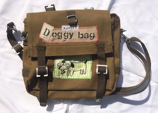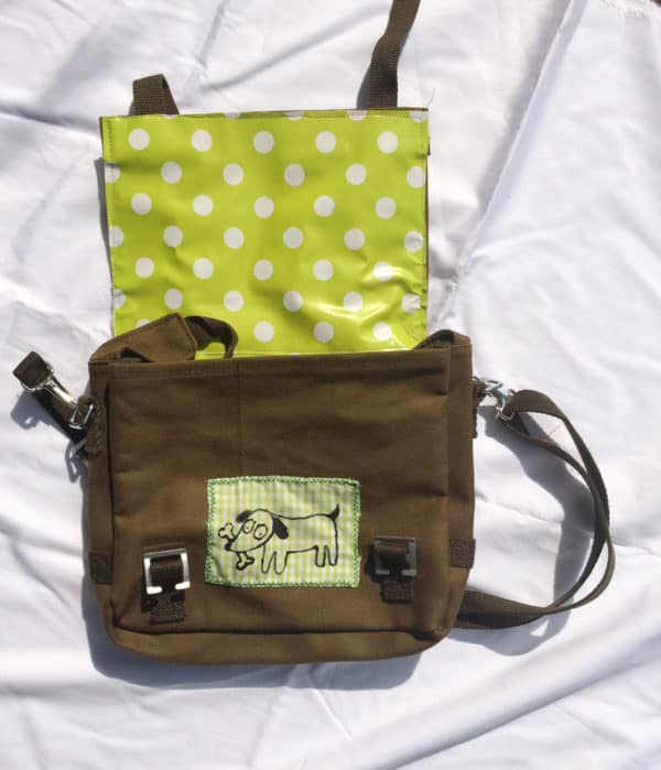 Für Hundebesitzer ein unverzichtbares Accessoire: die Hundtasche. Für alles, was man beim Gassigehen braucht: Leine, Leckerlis und leere Tütchen. Aus einer alten Bundeswehrbrottasche gefertigt, mit Wachstuchinnenfutter und netten Aufnähern. Doggy style to go gewissermaßen;-).