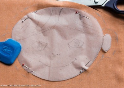 Kopf auf ein Papier zeichnen, ausschneiden. Den Stoff doppelt legen, die Vorlage mit den Stecknadeln festpinnen und den Kopf mit 1 cm Nahtzugabe ausschneiden.