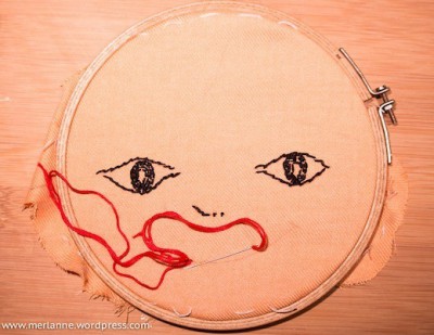 Das Gesicht auf den Stoff kopieren und aufsticken. Sommersprossen entweder mit Knötchenstich sticken oder mit Stoffmalfarbe aufmalen.