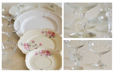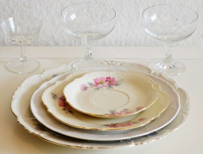 Nun ordnest du die Teller und Gläser so an, wie du die Etagère haben möchtest. Die Gläser habe ich unterschiedlich ausgerichtet, einige habe ich auf den Fuß gestellt, andere auf die Öffnung (siehe Fotos). Aber du kannst deiner Phantasie freien Lauf lassen und erstmal ausprobieren, welche Konstellation dir am besten gefällt. Aber Achtung, dabei kann man schnell dem Perfektionismus verfallen. Also am besten irgendwann mit einer Zusammenstellung zufrieden geben :-)