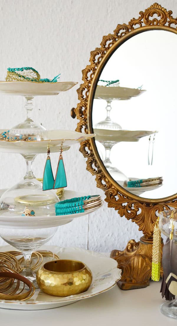 Man kann solche Etagèren für Gebäck und Cupcakes benutzen, aber auch für Schminke und Nagellack – ich platziere darauf meinen Schmuck: so habe ich ihn griffbereit und sortiert.
