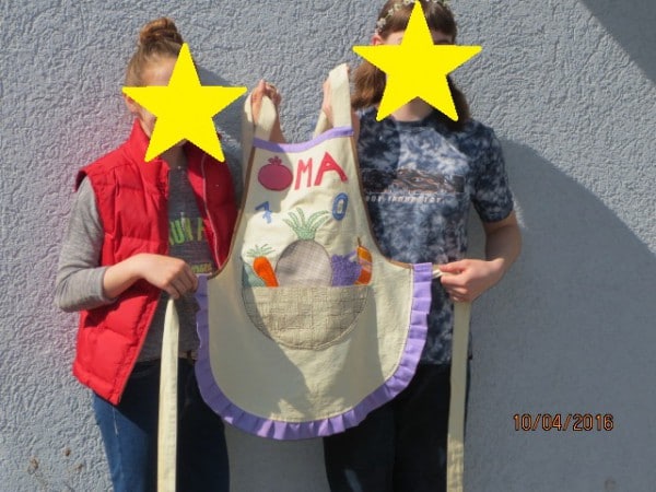Habe meine Tochter und meine Nichte betreut, sie haben gemeinsam eine Schürze für Omas Geburtstag genäht. Der Korb selbst ist eine Bauchtasche, das Obst und Gemüse ist „genähmalt“. Am oberen Ende ist nur ein Schrägband, die Rüsche hätte die Schrift verdeckt.