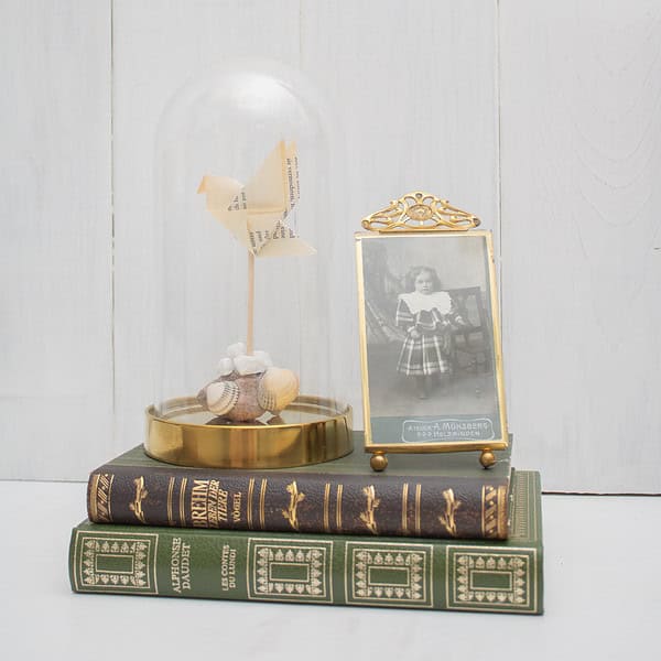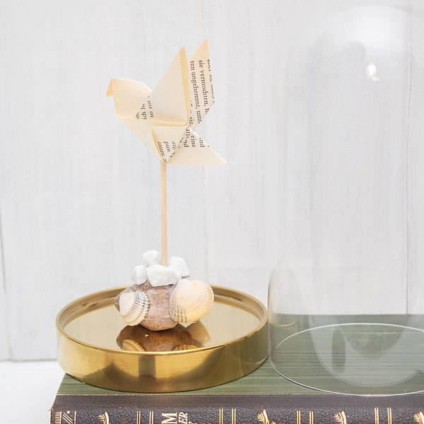 Ich bin ein riesiger Fan von Glasglocken! Nur fehlt es mir oft an Deko für drunter. Die Anleitung für den gefalteten Vogel stammt aus meinem Buch „Resteliebe Bücher“. Aber letztlich eignet sich auch jedes andere Motiv, etwa eine besonders schöne und große Muschel oder eine Figur. Und so geht’s: