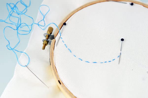 Befestige zunächst den Stoff im Stickrahmen, sodass dieser gut sitzt und keine Falten wirft. Finde dann den Mittelpunkt des Rahmens und markiere ihn mit einer Stecknadeln. Vom Zentrum ausgehend…