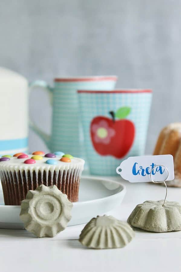Ich habe mir kleine Formen für Schoko-Pralinen aus dem Küchenschrank geholt und ein einfach mal ein paar hübsche Tischkärtchenhalter gebastelt. Das geht echt easypeasy: innerhalb von einer Stunde waren die praktischen kleinen Dinger fertig. Dann müssen sie nur noch ein paar Stunden trocknen und sind schon einsatzbereit.