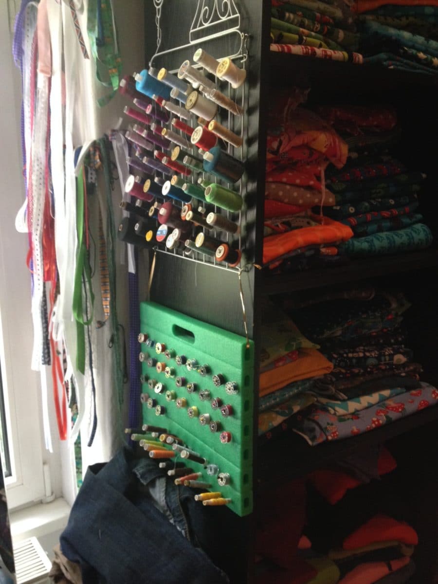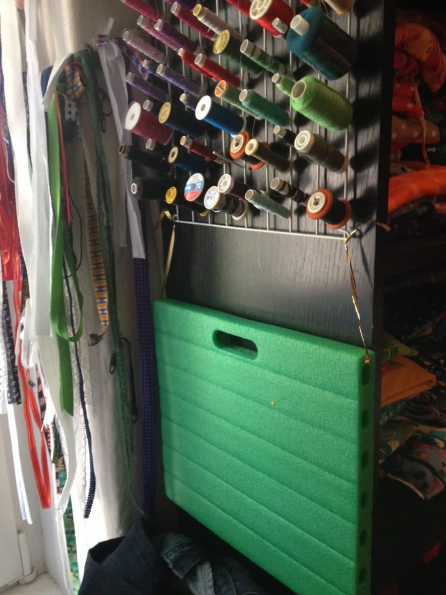 Kennt ihr das? Auf einmal packt es einen und monatelang immer wieder verschobene und laut rufende Aktionen werden auf einmal innerhalb von 5 Minuten zum Schweigen gebracht. Heute war bei mir so ein Tag. Seit Ewigkeiten riefen die Unterfadenspulen in meinem Nähkasten zu mir: “ Hilf uns hier raus! Befreie uns, zeig uns das Licht! Nein, nicht wieder den dunklen Deckel über uns zu machen.“ Das ganze ging sogar bis zum Aufstand einiger Betroffenen. Zu Demonstrationszwecken bildeten sie lange, eng verwobene Ketten, in der Hoffnung, dass ich so einmal an einem der vielen Fäden hängen bleiben würde und allesamt auf einen Streich mit an das Tageslicht ziehen würde. Ich konnte diese Misere einfach nicht mehr mit ansehen. Beim Kauf von Bodentuch, Wischtuch und Co. blieb mein Blick in der Gartenabteilung bei PocoDomäne an einer Knie-Unterlage aus Schaumstoff hängen. Mein durchs Nähen verschobener Blick sah darin gleich eine super Basis für einen Garnrollenhalter. Ich kaufte das Ding für ca. 3€ und überlegte noch, ob ich es mit Stoff bespannen möchte, verwarf wegen Zeitknappheit den Plan jedoch schnell. Geplant war, dass ich einfach lange Nägel hineindrücken wollte, zu Hause zeigte sich dann, dass zumindest ein paar alte längere Stecknadeln, die wegen der dicken Köpfe sich eh nicht so gut zum Nähen eignen, dann doch etwas schöner sind. Die Knieplatte hat auf der Seite Löcher, durch die ich gut ein Band ziehen konnte und dieses an meinem Snaply-Garnrollenhalter (für 30€) festbinden konnte. Meine Konstruktion hält bisher und ich bin auf meinen Einfall doch ein bisschen Stolz, bin ich doch sonst so rein gar nicht bastelmäßig kreativ. Meinen Unterfadenspulen jedenfalls gefällts, sind sie doch von der unübersichtlichen Holzkiste zum Logenplatz am Fenster aufgestiegen.