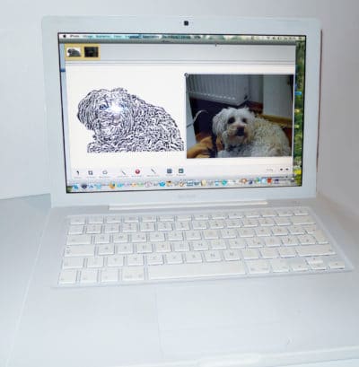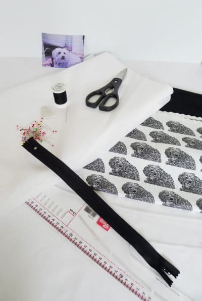 Alles fängt natürlich mit einem Foto an. Dieses verarbeite ich zu einem stilisierten Bild – ganz nach Wunsch des Auftraggebers. In diesem Fall habe ich den Hund in ein Art gezeichnetes Schwarz-Weiß-Bild verwandelt. Ein buntes Bild oder eine 1:1 Fotoabbildung wären genauso möglich. Dann versende ich das Bild an eine Stoffdruckerei.