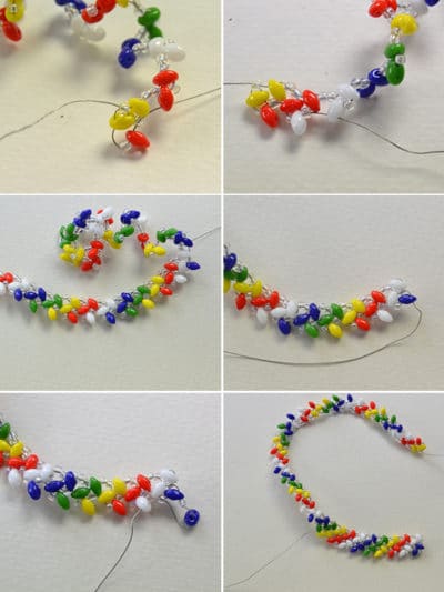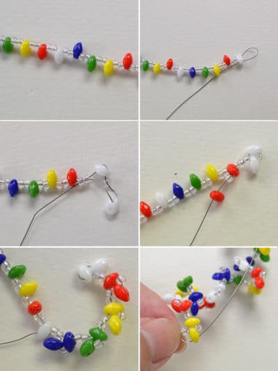 1).schneiden einen Teil der 0,3mm Tiger Schwanz. Dann fädeln 2 klare Rocailles, ein gelbe 2-Loch Rocailles , 2 klare Rocailles, ein rote 2-Loch Rocailles , 2 klare Rocailles, ein weiße 2-Loch Rocailles , 2 klare Rocailles, ein blaue 2-Loch Rocailles , 2 klare Rocailles, eine grüne 2-Loch Rocailles in der Folge auf den Tiger Tail. Wiederholen Sie diesen Schritt fünfmal. Dann Faden 2 Rocailles, ein gelbes, 2-Loch Rocailles , 2 klare Rocailles, ein rotes 2-Loch Rocailles , 2 klare Rocailles und einem weißen 2-Loch Rocailles.