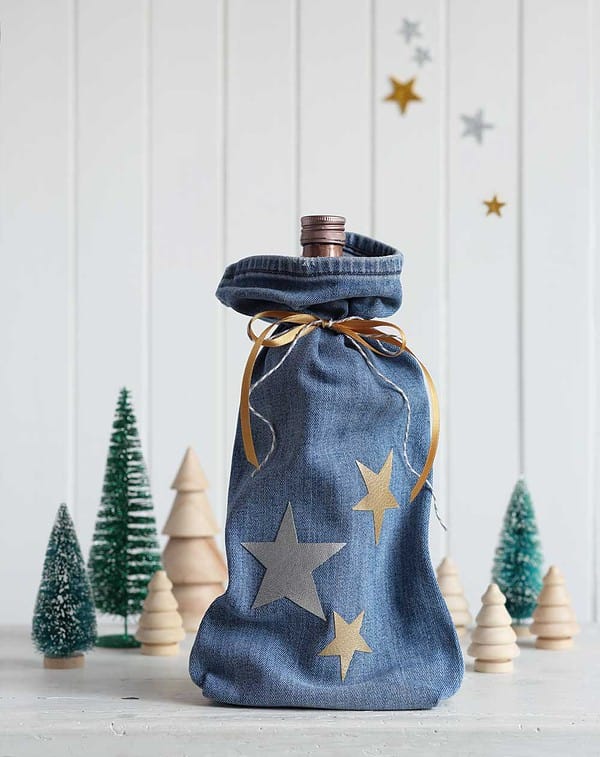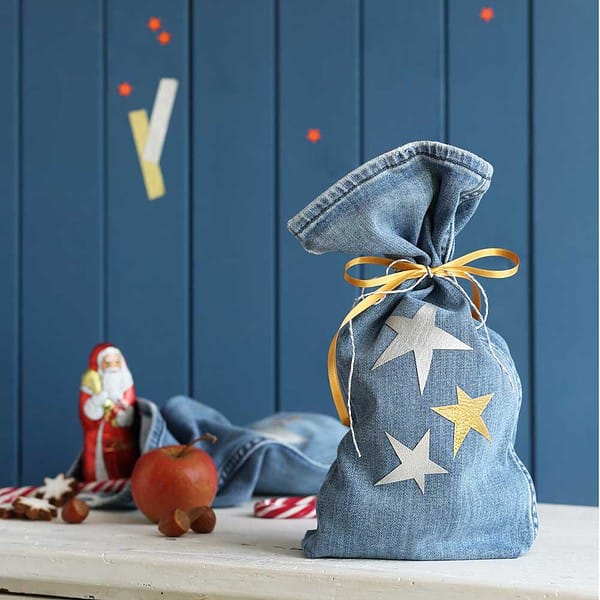 Für alle Upcycling-Liebhaber: Ausrangierte Jeanshosen werden zu wiederverwendbaren Geschenkverpackungen.