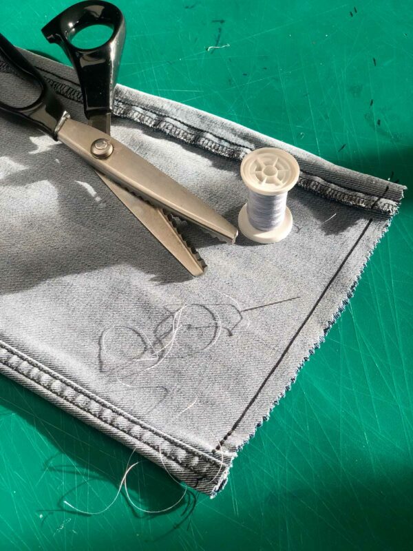 - Schneidet das Jeansbein etwa unterhalb des Knies ab – wenn ihr habt, mit einer Zickzack-Schere. Legt Naht auf Naht und näht dann die Öffnung mit etwas Abstand zur Schnittkante gerade zu. Wenn ihr wollt, könnt ihr jetzt Feierabend machen und das vernähte Bein als Säckchen für Geschenke nutzen. Eine hübsche Schleife mit Anhänger darum – fertig!