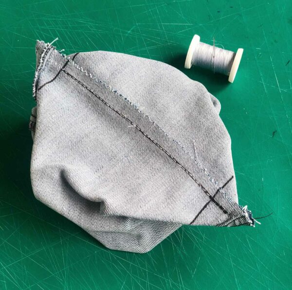 2. Soll der Beutel etwas mehr Standfläche haben, näht die beiden Ecken ein Stück 90 Grad zur Schnittkante zu. So entsteht mehr Volumen. Ich habe dann mit Bügelvlieseline (beidseitig klebend) noch Kunstledersterne appliziert. Das Vlies auf die Rückseite des Kunstleders aufbringen, Sterne ausschneiden, Schutzfolie abziehen und dann durch ein trockenes Tuch (damit das Leder nicht schmilzt) auf das Säckchen aufbügeln.