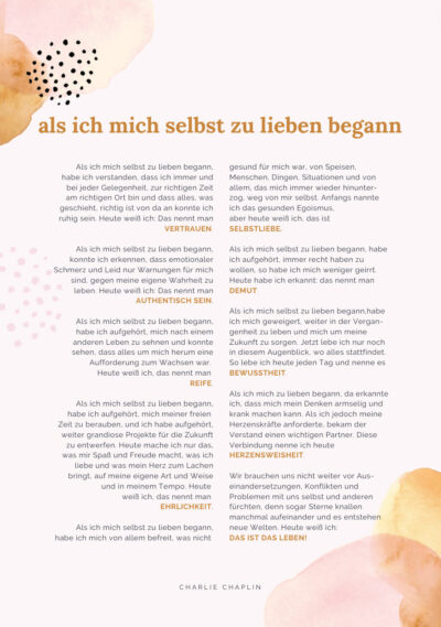Unseren Beitrag für mehr Selbstliebe in der Welt findet ihr hier: https://www.handmadekultur.de/projekte/wall-art-print-als-ich-mich-selbst-zu-lieben-begann-von-charlie-chaplin_232912