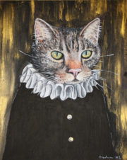 „Ist die Katze aus dem Haus“ besteht aus einem Essstäbchentisch mit Spitze, einem Scrabblestein mit Katzenbriefmarke, und einer Gummimaus.