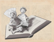 In meiner künstlerischen Arbeit sind Bücher sind meine Inspiration und mein Material. Im Original habe ich die beiden lesenden Kinder mit Acrylfarbe auf Leinwand gemalt und mit Fragmenten aus alten, zerliebten Buchseiten zur Buch Collage gestaltet. Diesen Digitaldruck sende ich Dir in einem einzeln angefertigten, handgemachten Passepartout mit einer Buchseiten Collage.