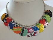 Vier Holzbuchstaben sind mit roter Acrylfarbe bemalt und anschließend mit Streifen aus recycelten Getränkedosen dekoriert.