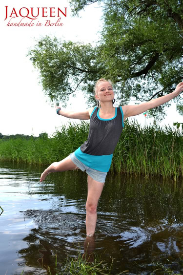 Auffällig ist ausserdem das elastische, asymetrische Bündchen unten am Saum, welches eine wunderschöne Silhouette zaubert.