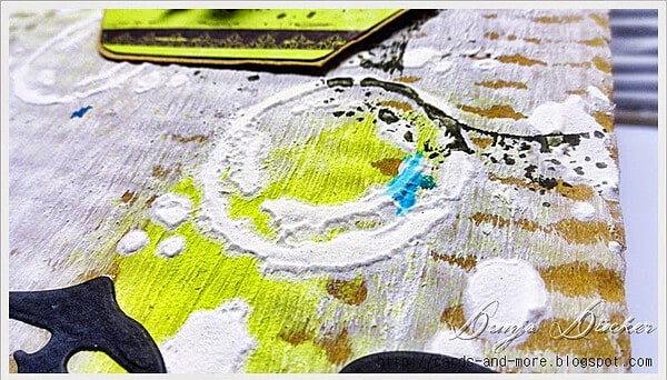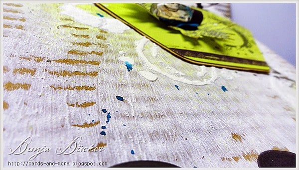 Nach der nächsten Trocknungsphase habe ich mir die Dutch Mask Art A5 Burlap ausgesucht und Farbsprays, einmal türkis und einmal ein Perlmutt Glitzer. In den Close-Up's könnt Ihr das besser erkennen. Nachdem alles gut getrocknet ist, habe ich Gelmedium auf das TAG aufgetragen. Da es so schön transparent trocknet, kann man die kleinen Kügelchen (oder Glitter etc.) einstreuen. Der Effekt ist wirklich erst zu sehen, wenn alles gut getrocknet ist ;)