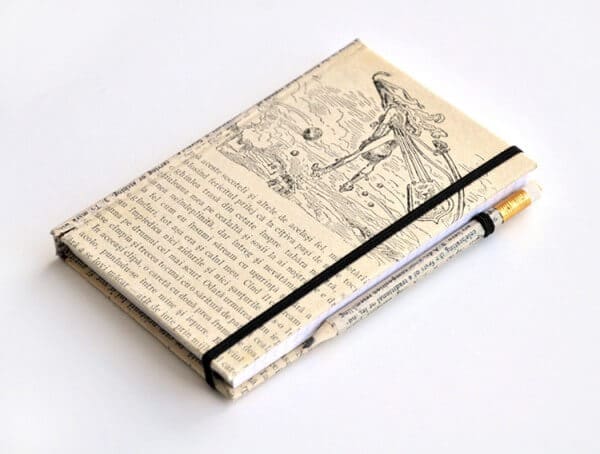 Und nun zu meinem Geschenk: Ich mag Bücher. Und ich mag schöne Notizbücher, das dürfte schon bekannt sein ;-). Nun, die Notizbücher, die man normalerweise kaufen kann, sind nicht besonders schön, sondern eher neutral und nichts sagend. Aber man kann sie verschönern, zum Beispiel mit alten Buchseiten!