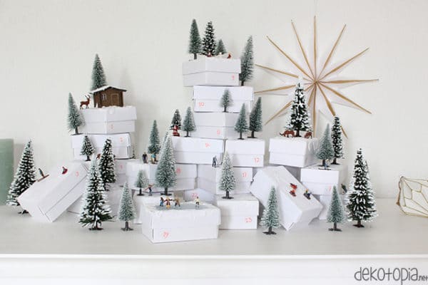 Wie wäre es dieses Jahr mit einem Adventskalender-Winterwald? Dieser hier besteht aus gestapelten Boxen, dekoriert mit Kunstschnee und Modellfiguren.