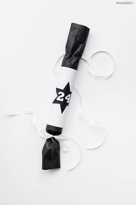 2. Schneide Geschenkpapier in 24 passend große Stücke, so dass die jeweiligen Enden überstehen. Verpacke die Pappröhren und schließe erst die eine Seite mit einem Schleifenband.