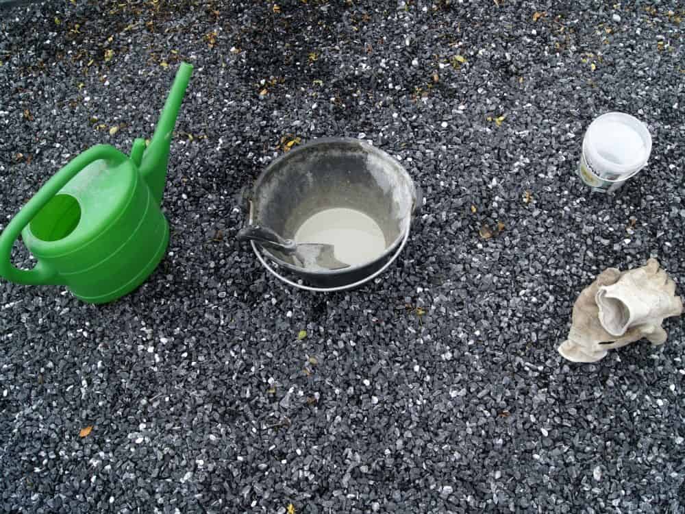Den Beton gibst du nun mit der Schaufel vorsichtig in den Joghurtbecher. Den kannst du vorher mit Öl einfetten, damit der Beton im Anschluss leicht herauszuheben ist.