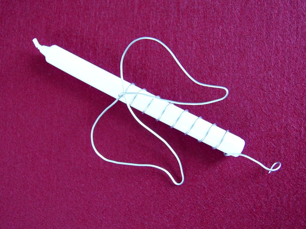 Die Kerze wird in regelmässigen Abständen dicht mit Draht umwickelt. Den unteren Drahtrest kannst du ebenfalls etwas biegen, um einen besseren Stand der Kerze zu erzielen.