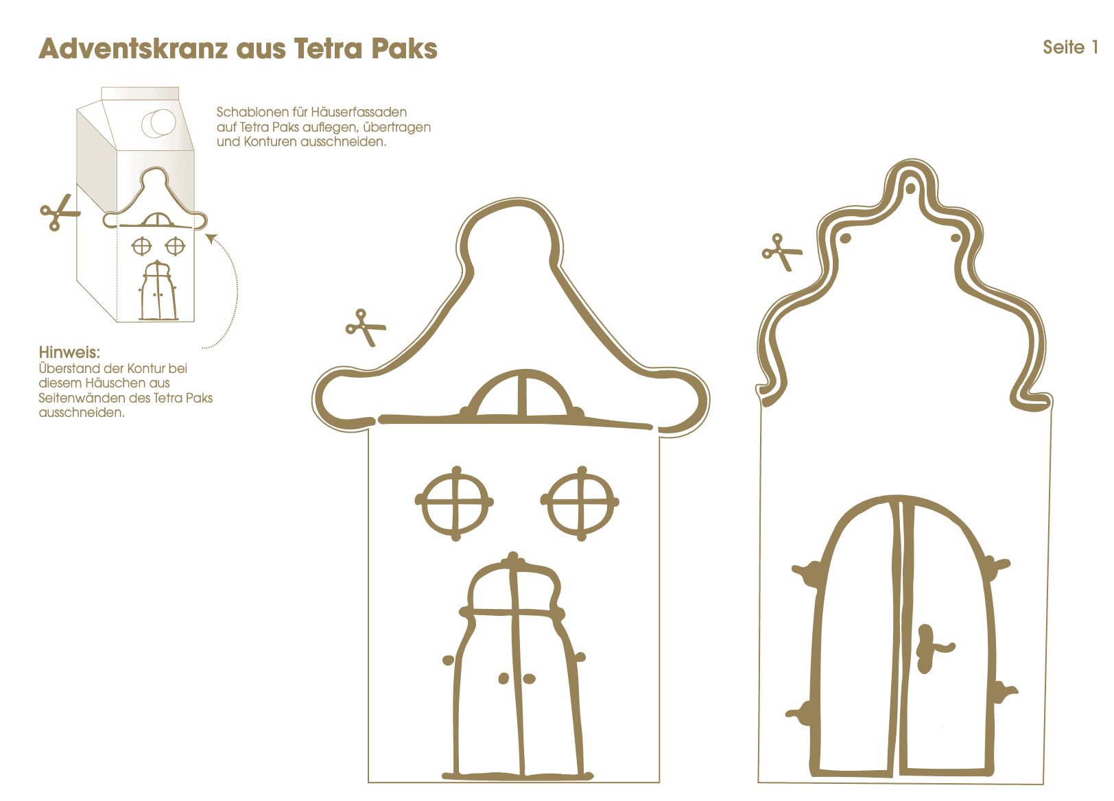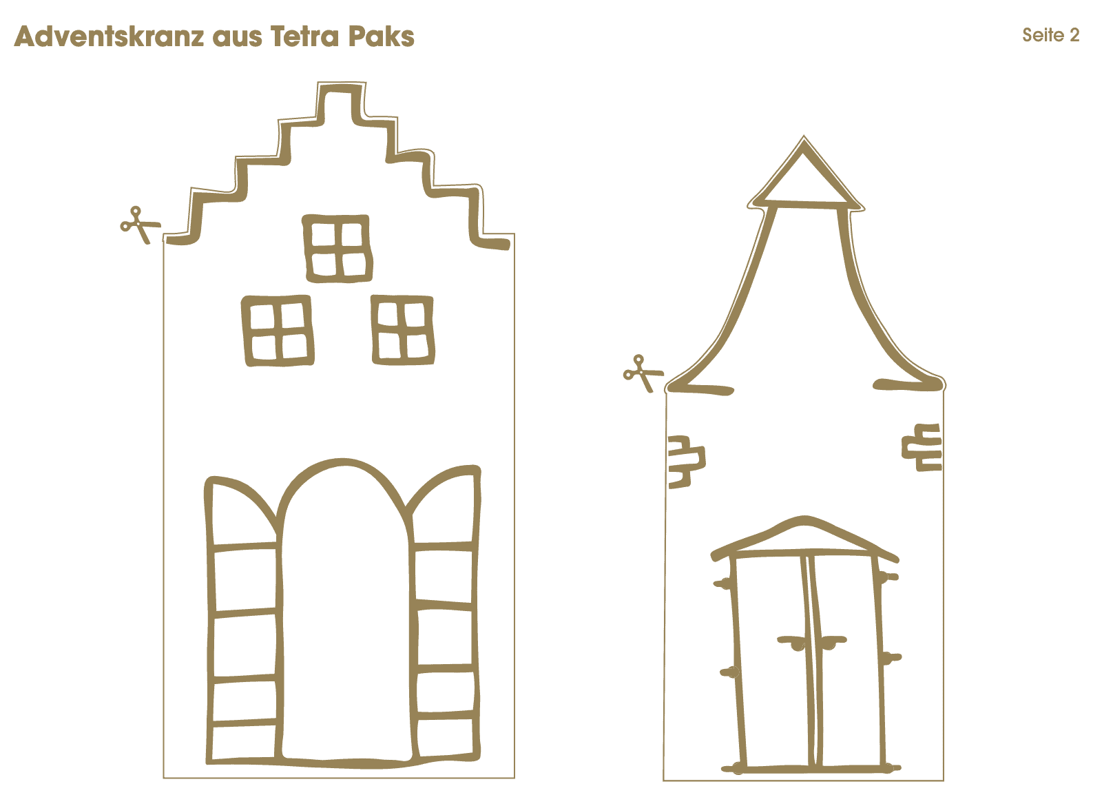 Schritt 1: Tetra Paks gründlich ausspülen und gut abtrocknen. Schablonen für Häuserfassaden auf Tetra Paks auflegen, übertragen und Konturen ausschneiden. Anschließend jeweils zwei Tetra Paks mit kupferfarbenem und cremefarbenem Sprühlack gleichmäßig besprühen und vollständig trocknen lassen. Für eine intensivere Farbwirkung den Vorgang bei Bedarf wiederholen.