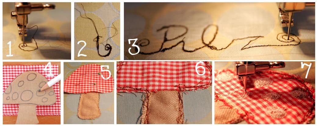 4) Zeit für das Motiv. Vorgezeichnet auf Packpapier, übertragen mit Bleistift. 5) Am Besten so feststecken, dass man um die Ränder problemlos herum kommt. 6) Mit braunem Garn wurden die Außenlinien bearbeitet. Ruhig öfters drum herum fahren und auch knapp am Rand nähen, das Motiv franst natürlich aus. Aber es sieht schön aus. 7) Für die Punkte habe ich weißes Garn eingefädelt und mir die Kreise vorgezeichnet. Außen anfangen und kreisförmig nach innen sticken. Dass es dabei manchmal "rupft" ist normal, manchmal verheddert sich aber der Oberfaden doppelt unter dem Transporteur und die Maschine hakt. Dann natürlich das Fadenwirrwar abschneiden, neu einfädeln und dann gehts weiter.