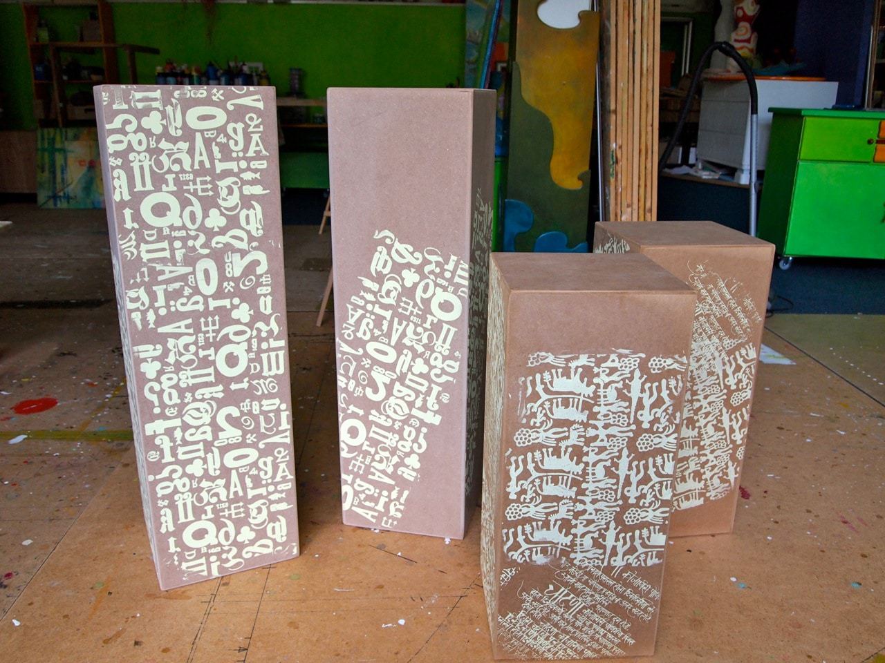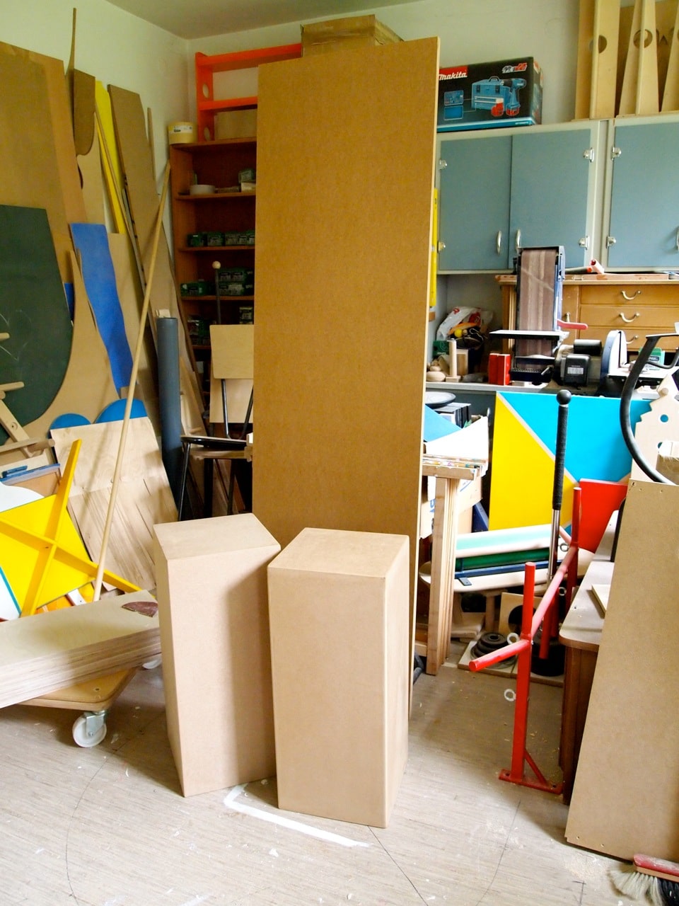 Die beiden tragenden Säulen des Tisches sind die sogenannten "Galeriesockel" aus MDF, die es bei Boesner zu kaufen gibt.