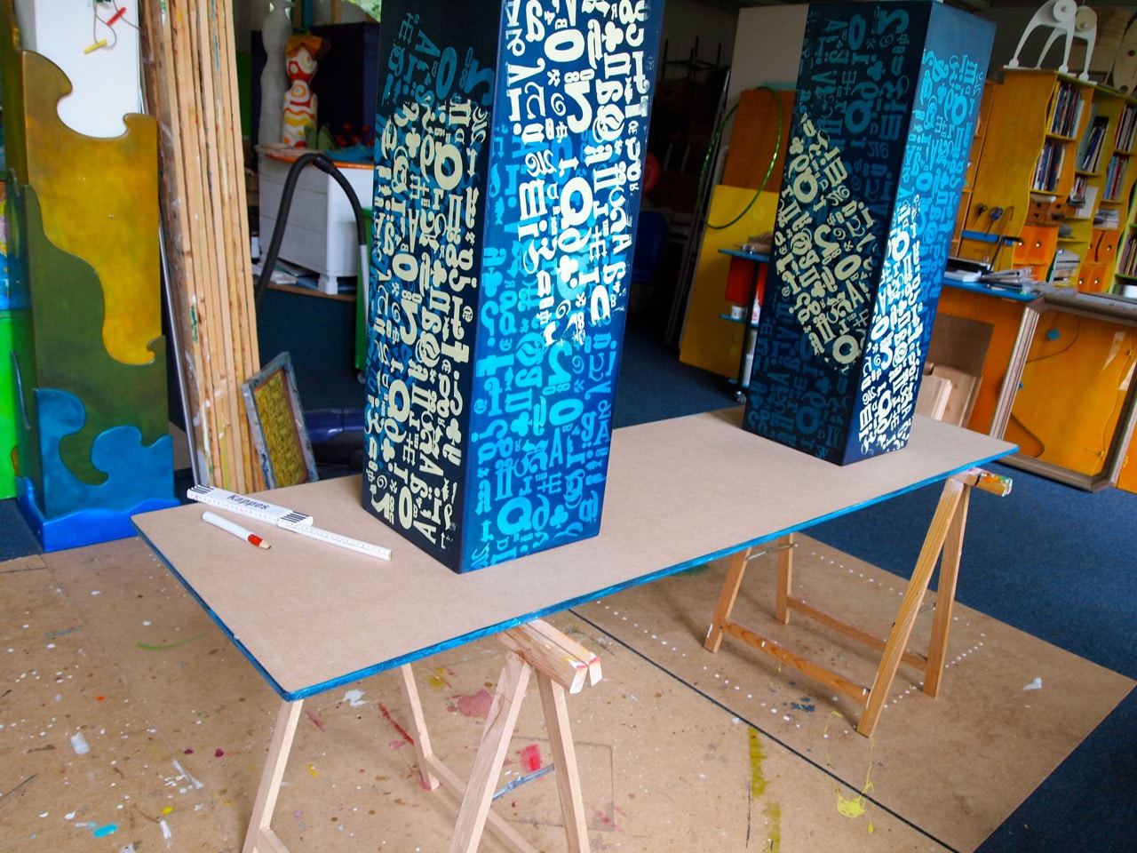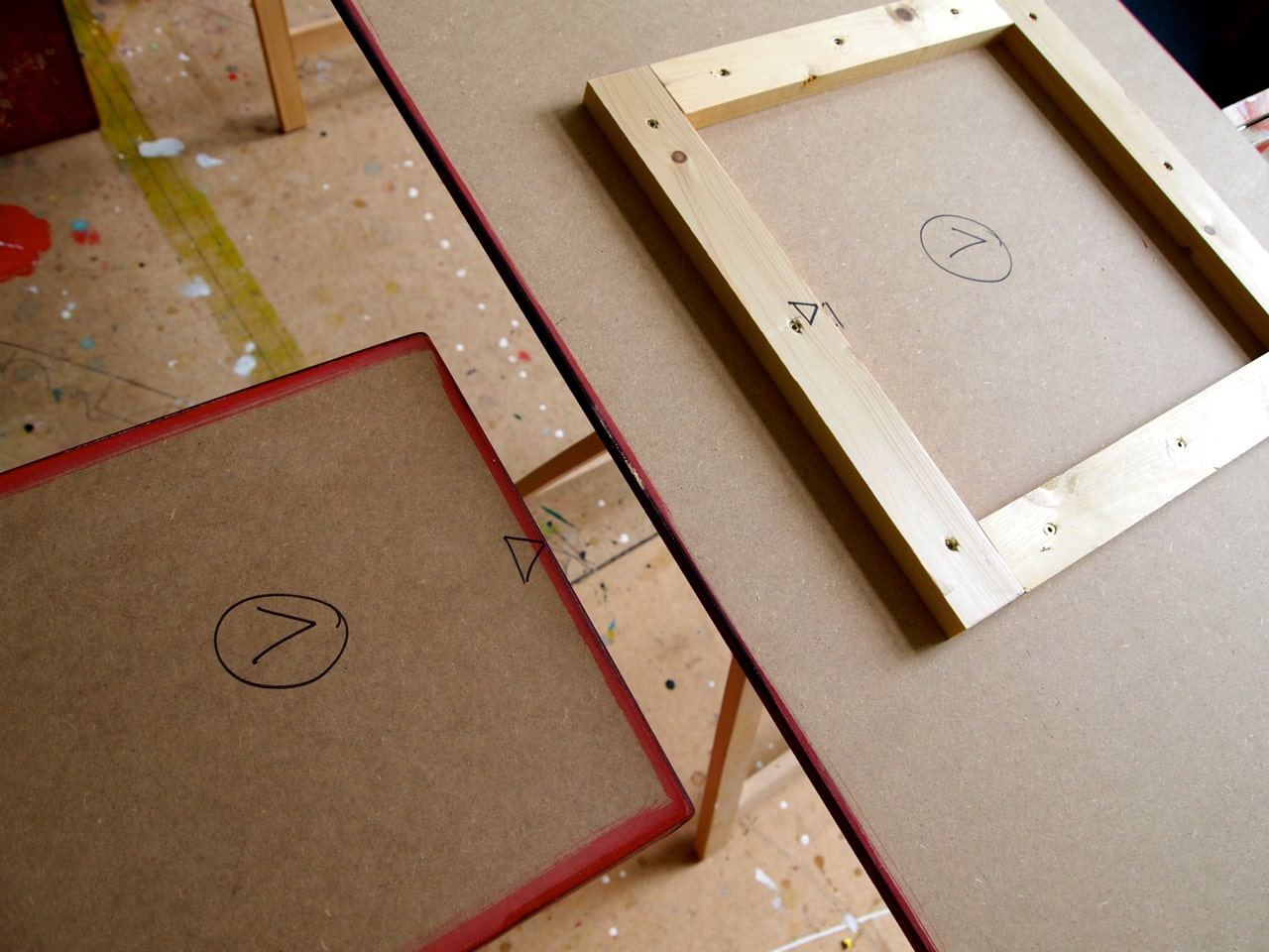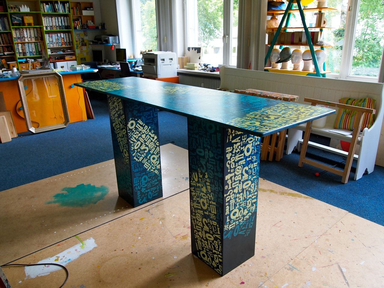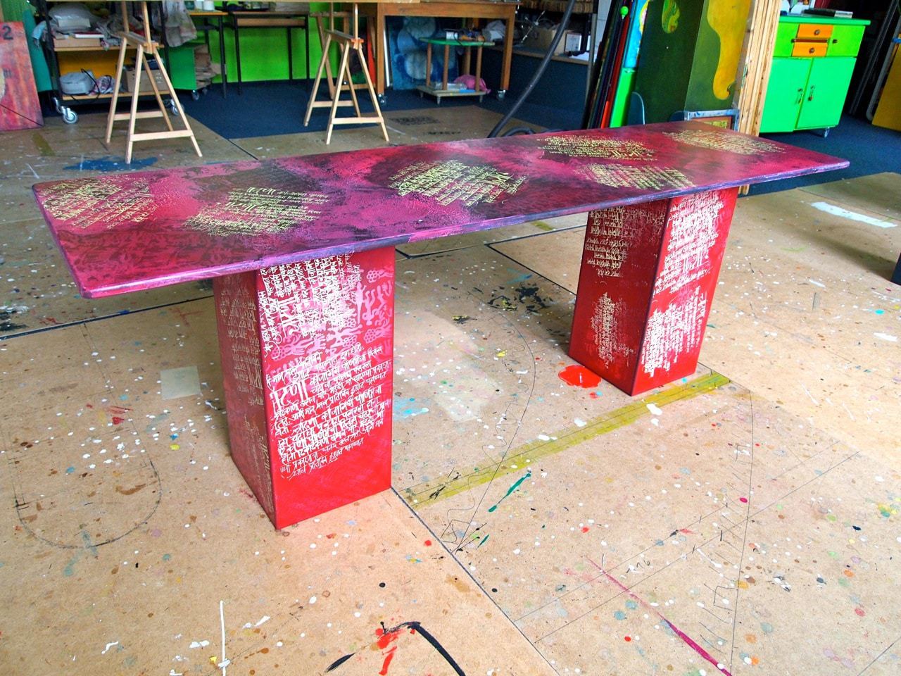 Weil dies "nur" Arbeitstische werden, die sicher auch nachher noch reichlich Farbklekse abbekommen, habe ich hier nur eine relativ einfache Gestaltung in Siebdrucktechnik vorgenommen.