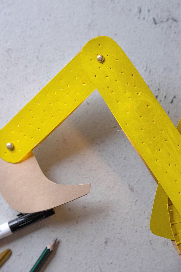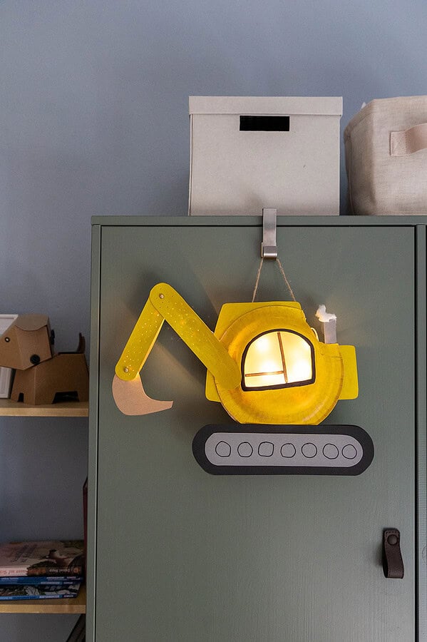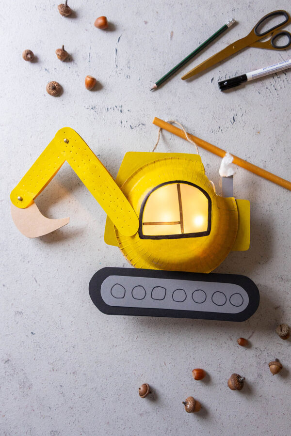 Diese Laterne bringt Kinderaugen zum Leuchten! Mit Papptellern, Tonkarton und einer einfachen Bastelvorlage bastelst du im Handumdrehen eine stabile Bagger-Laterne mit beweglichem Arm.
