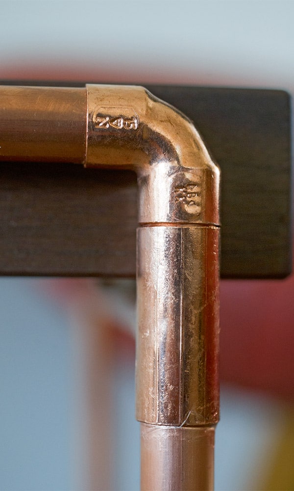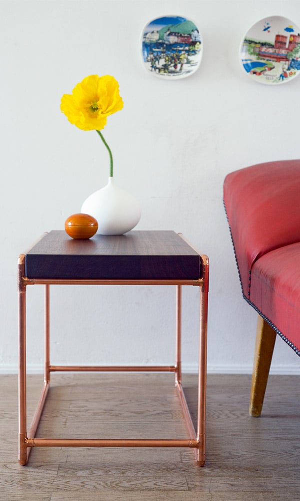 Befreien wir das Kupferrohr aus den Sanitärecken der Baumärkte und führen es höheren ästhetischen Zwecken zu! Das zart schimmernde Halbedelmetall lässt sich super schneiden, stecken und kleben. Und mit Fittings (Verbindungsstücken wie Muffen) zu einem Beistelltisch à la Eileen Gray zusammenbauen.