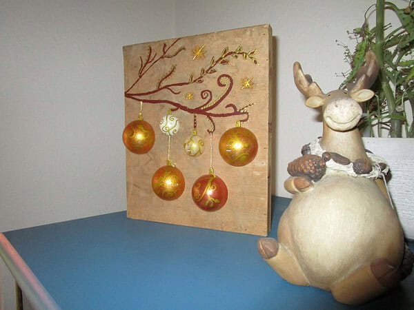 Beleuchtetes Bild mit Weihnachtskugeln auf Holz